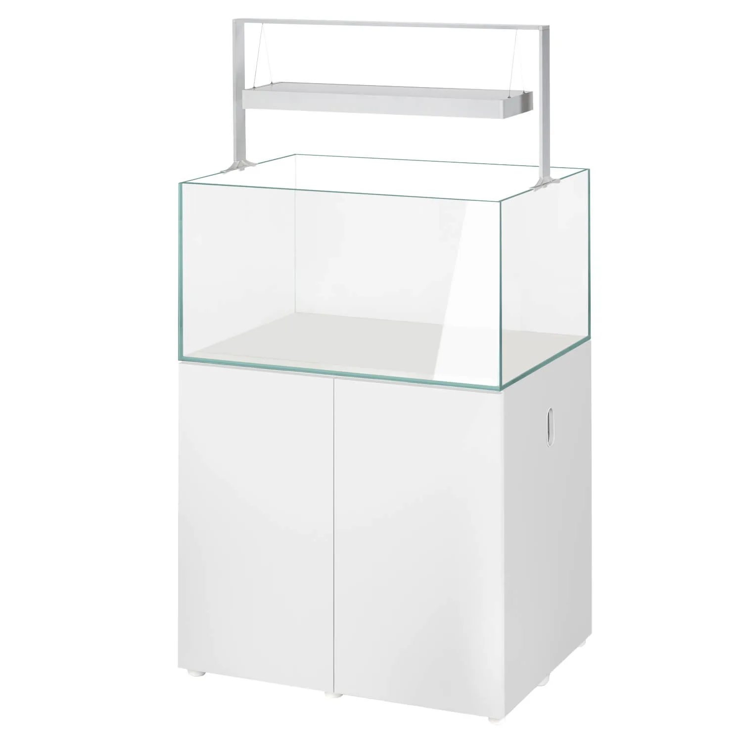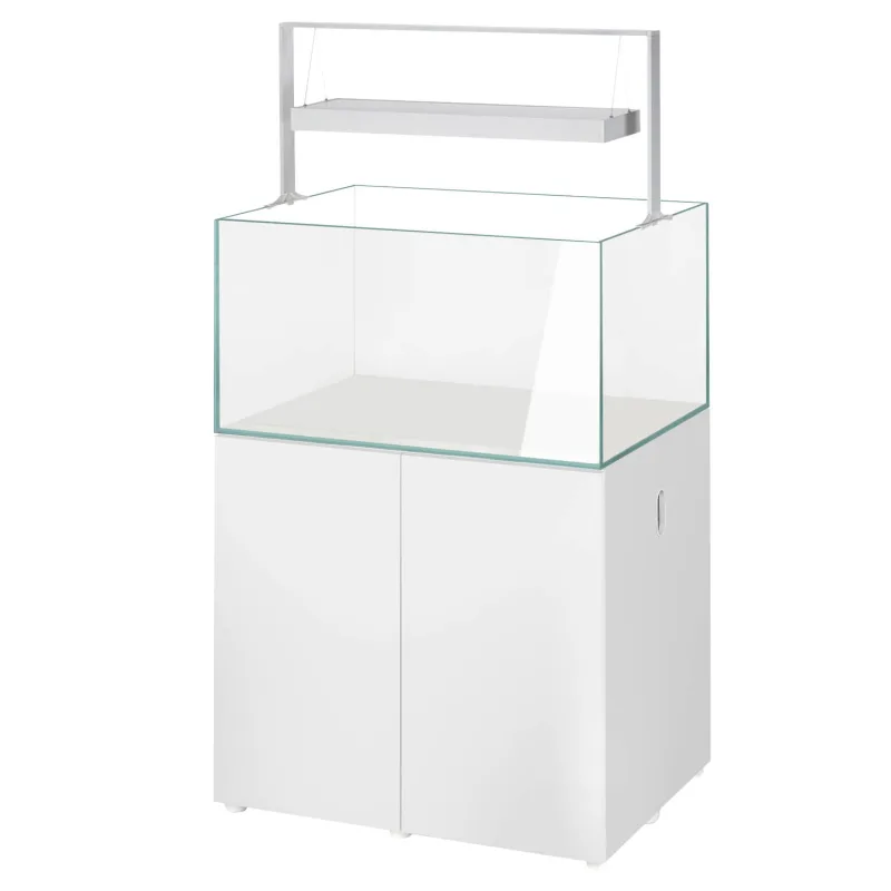 Fabricado em vidro do tipo Opti, o tanque aberto é feito de vidro espesso e de alta qualidade que não necessita de reforço adicional. É fornecido completo com uma luz dedicada montada numa estrutura elegante e ajustável em altura. A luz utiliza módulos Leddy Tube substituíveis, o que significa que pode atualizar ou substituir componentes individuais sem ter de mudar toda a unidade. Todos os detalhes foram cuidadosamente considerados, desde o refinado revestimento do cabo até ao tapete de proteção incluído, garantindo um acabamento limpo e de qualidade superior.